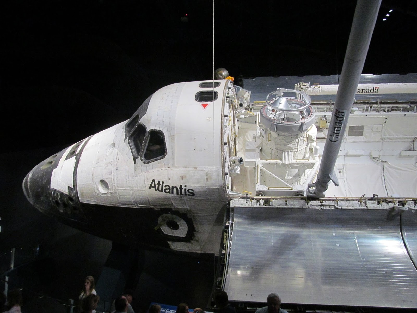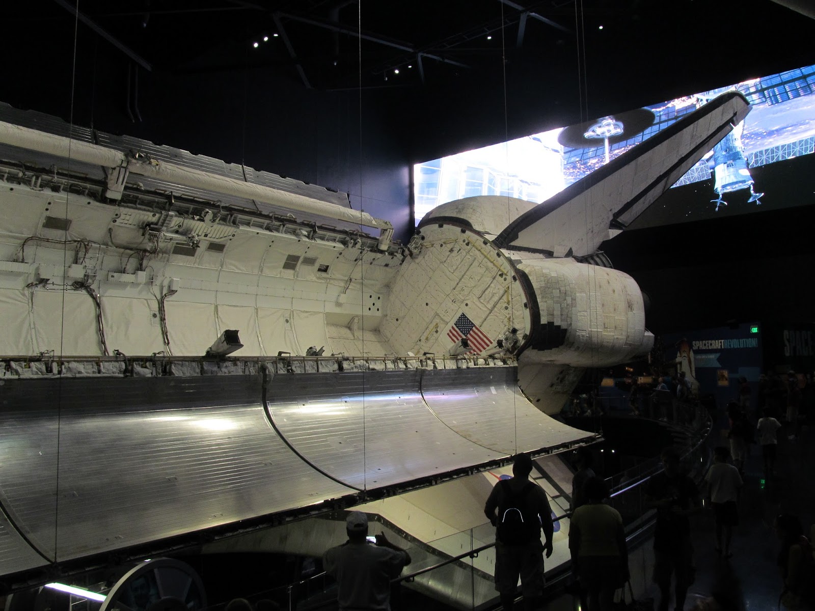 Then, finally, we were ushered into a room where we watched a short film that, though very cheesily written, depicted the genesis of the shuttle program. The the doors beneath the screens opened, and we were funneled into a smaller, cone shaped room with a smaller, roundish projection screen directly ahead. It was pretty obvious that this screen was the entrance to the actual exhibit, but the launch videos were pretty amazing, and the music appropriately bombastic and inspiring. Then I saw an inner door behind the projection scrim rise up, though the projected star field kept what was beyond obscured. Then, with a final musical flourish, the scrim rose, and we beheld Atlantis!